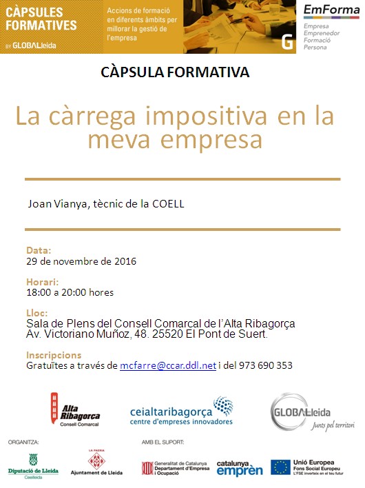 “La càrrega impositiva en la meva empresa” és el títol de la càpsula que oferirà el CEI Alta Ribagorça el dimarts 29 de novembre, i que anirà a càrrec de Joan Vianya, tècnic de la COELL. Aquesta càpsula formativa té com a objectiu determinar quines despeses són deduïbles fiscalment i la incidència dels impostos.