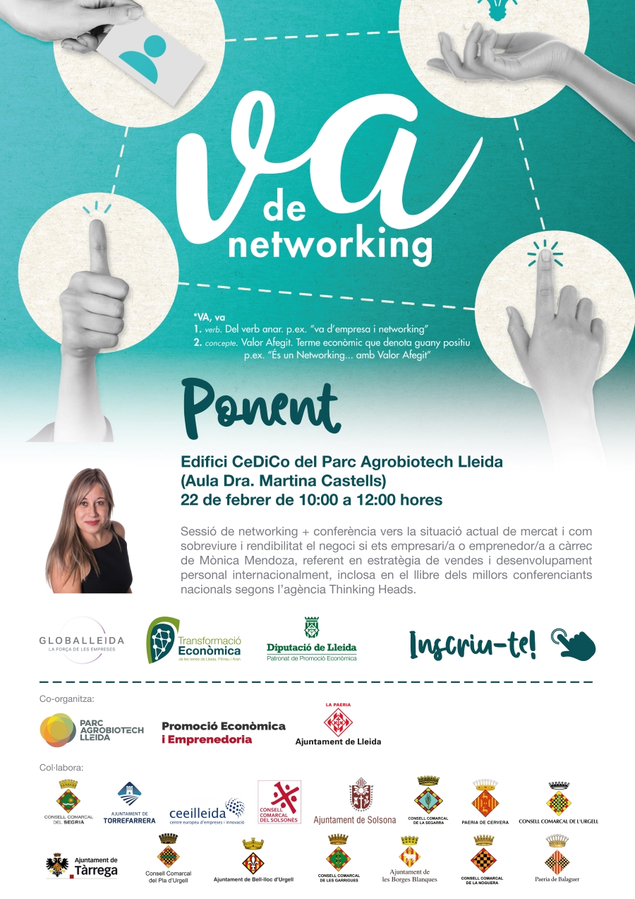 El Va de Networking a Ponent es realitzarà aquest dimecres, 22 de febrer, a l’Edifici CeDiCo del Parc Agrobiotech Lleida, de 10:00 a 12:00 hores, i el Va de Networking al Pirineu també serà aquest dimecres, 22 de febrer, a l’Edifici Epicentre de Trempde 16:30 a 18:30 hores .