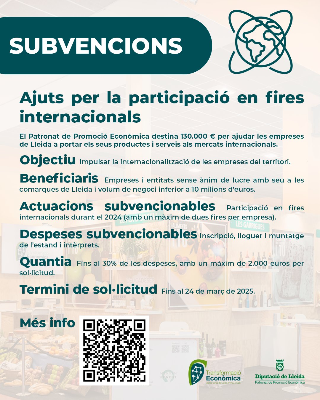 El Patronat de Promoció Econòmica de la Diputació de Lleida, en la seva aposta per la internacionalització de les empreses de la demarcació, ha obert un any més la convocatòria d’ajuts per a la participació en fires i salons d’àmbit internacional corresponent a l’any 2024. Aquesta línia de subvencions compta amb una dotació de 130.000 euros i està dirigida a empreses i entitats sense ànim de lucre amb seu a les comarques de Lleida.