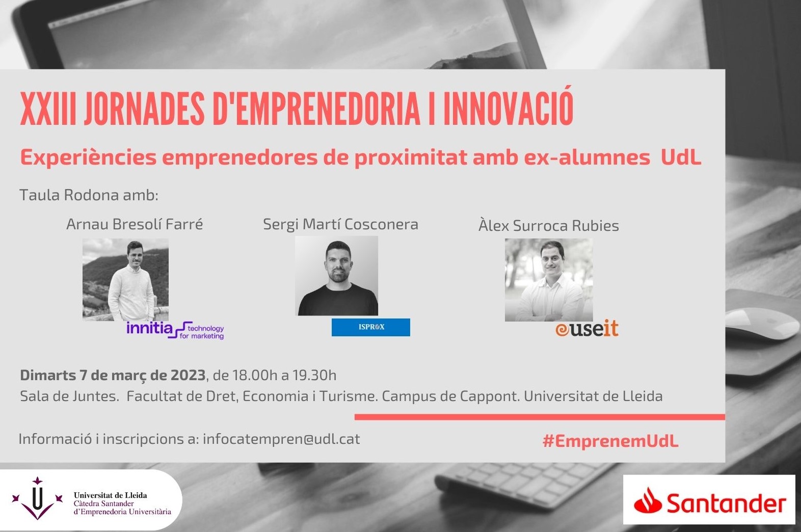 La Càtedra Santander d’Emprenedoria Universitària, en el marc de les XXIII Jornades d’Emprenedoria i Innovació, organitza una taula rodona amb el títol Experiències emprenedores de proximitat amb ex-alumnes UdL.