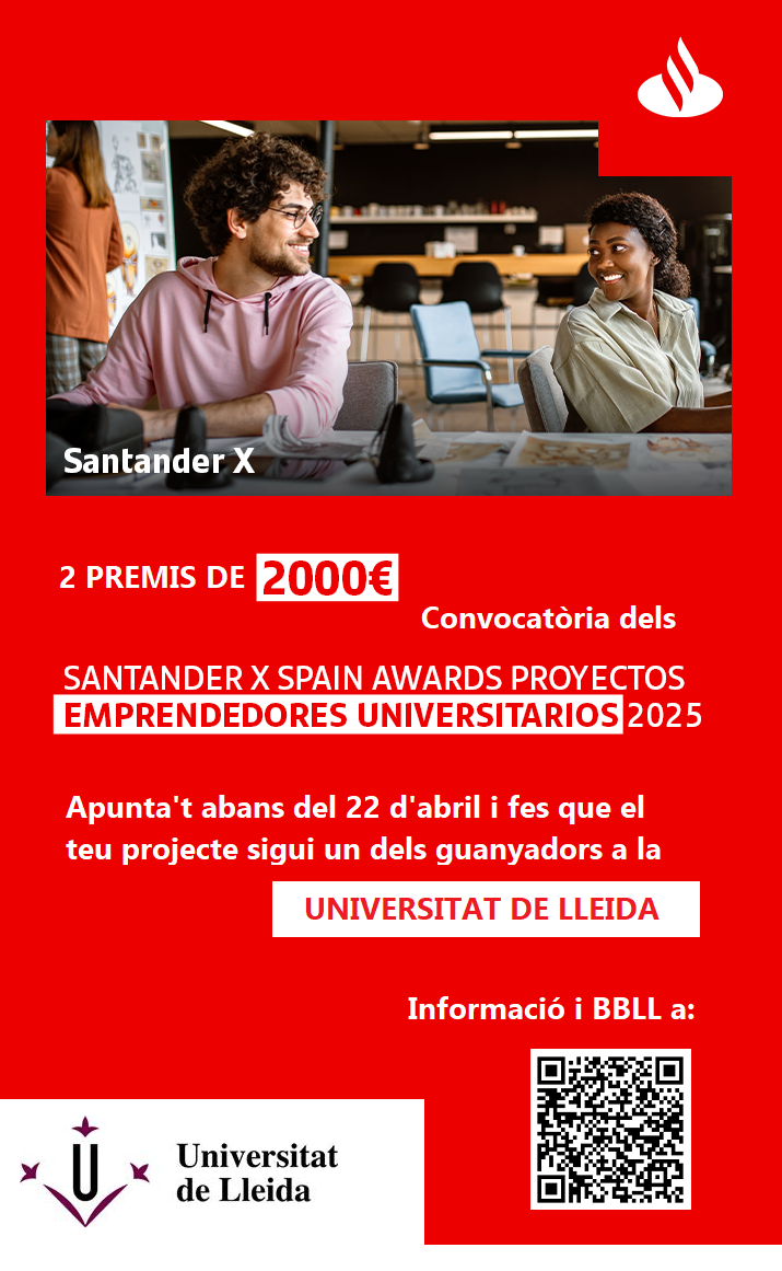 La UdL ha impulsat, conjuntament amb Banco Santander, una convocatòria per captar projectes emprenedors dins de la Universitat, amb l’objectiu de reconèixer i potenciar, a nivell estatal, els millors projectes emprenedors universitaris.