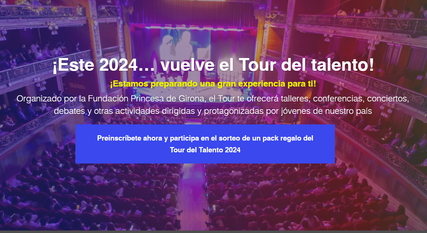 La Fundació Princesa de Girona (FPdGi) impulsen el Tour del Talent, que se celebrarà a Lleida del 22 al 26 de gener de 2024, amb una àmplia agenda d‘activitats destinades a potenciar el talent jove. D’entre les diferents activitats, consideren que les següents poden ser d’interès per a totes aquelles persones vinculades amb la gestió i el desenvolupament del talent jove en el món empresarial: