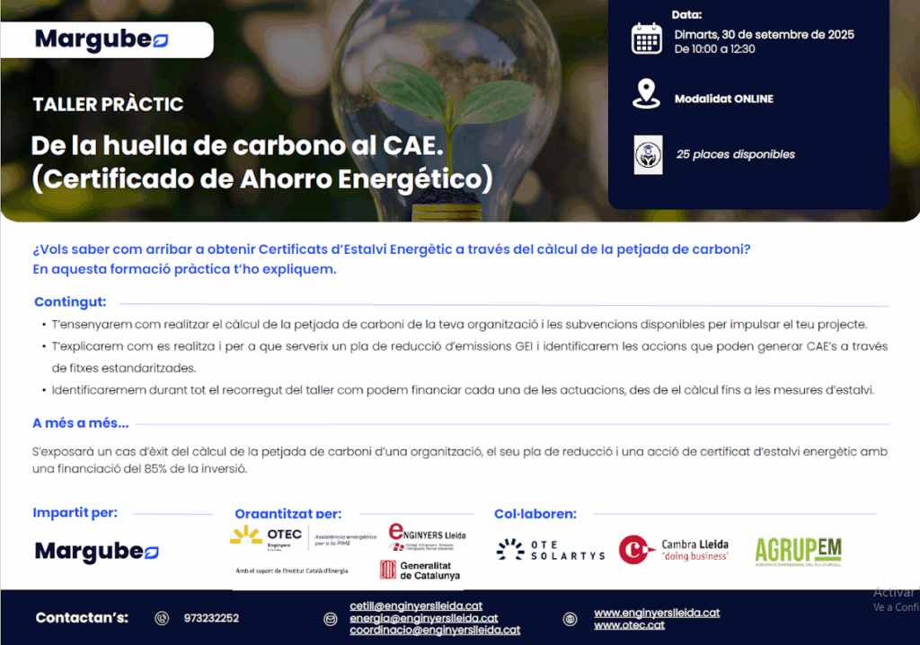 L'Oficina de Transició Energètica del Col·legi d'Enginyers Tècnics Industrials de Lleida ha organitzat el taller online De la huella de carbono al Certificado de Ahorro Energético, dirigit…