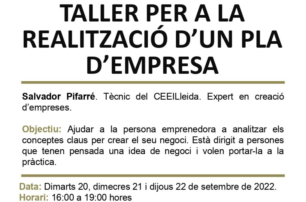 Taller sobre com realitzar un pla d’empresa, el 20, 21 i 22 de setembre al CEEILleida