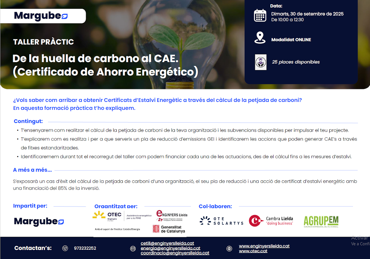 L’Oficina de Transició Energètica del Col·legi d’Enginyers Tècnics Industrials de Lleida ha organitzat el taller online De la huella de carbono al Certificado de Ahorro Energético, dirigit a empreses de Lleida, però en concret a pimes industrials i de serveis connexos (beneficiàries de la subvenció Cupons Green de ACCIÓ).