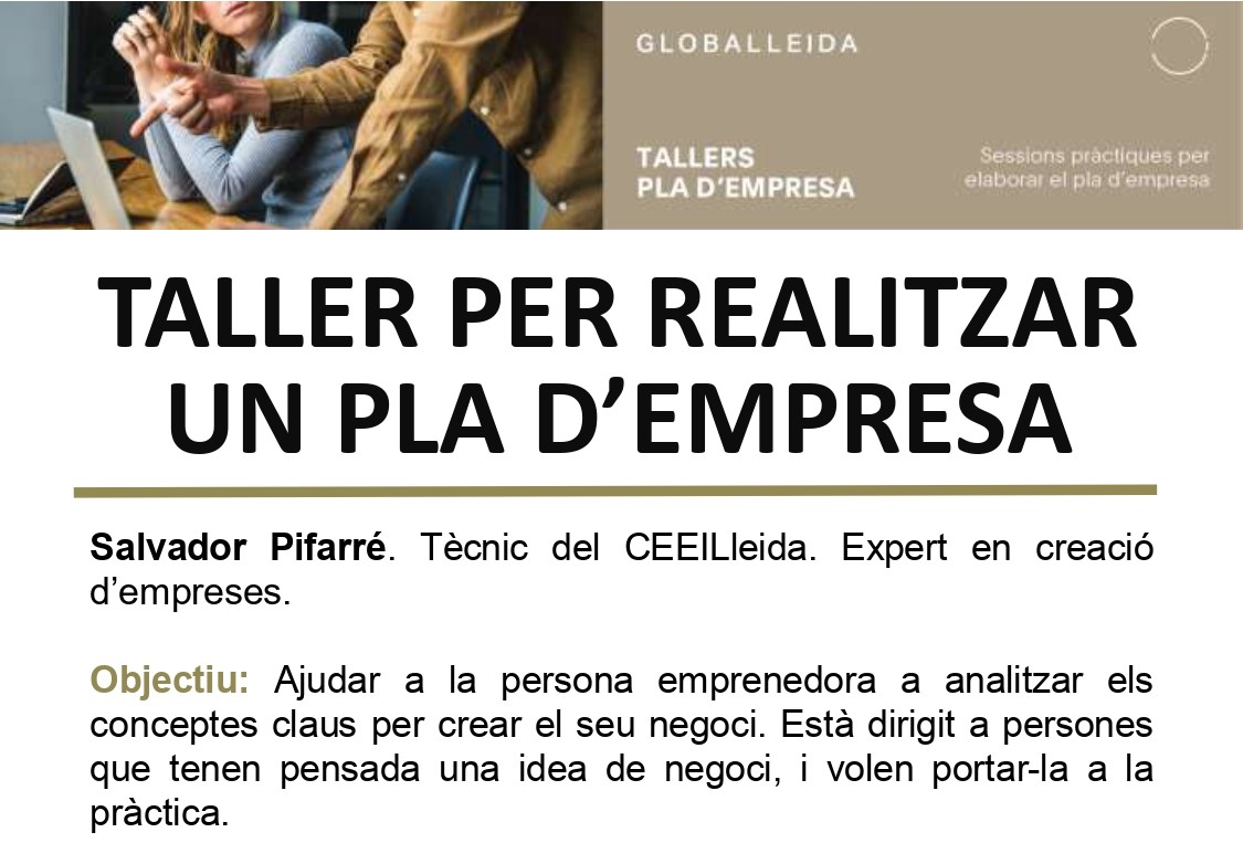 El taller anirà a càrrec de Salvador Pifarré, tècnic del CEEILleida i expert en creació d’empreses. La formació té com a objectiu ajudar a la persona emprenedora a analitzar els conceptes claus per crear un negoci.