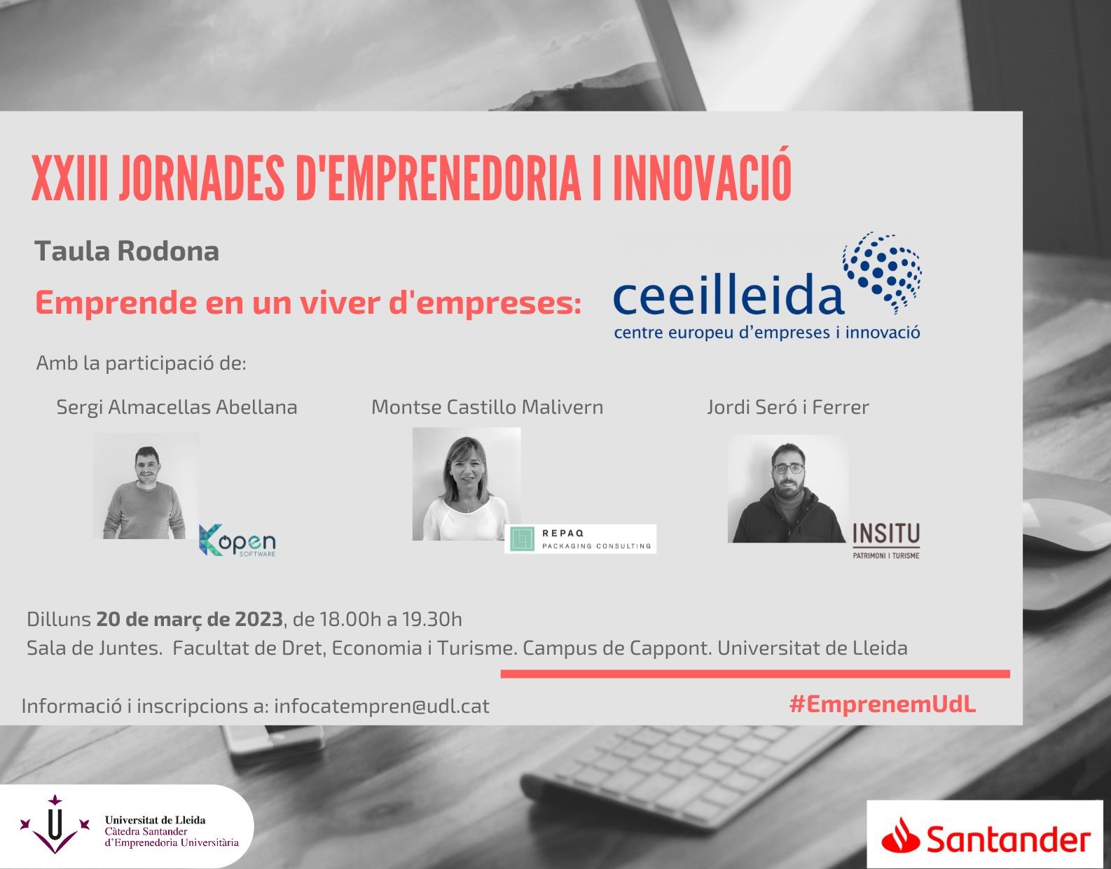 Tres emprenedors que han creat la seva empresa al CEEILleida seran els protagonistes de la taula rodona Emprendre en un viver d’empreses, organitzada per la Càtedra Santander d’Emprenedoria Universitària, en el marc de les XXIII Jornades d’Emprenedoria i Innovació. La taula rodona comptarà amb la participació de: