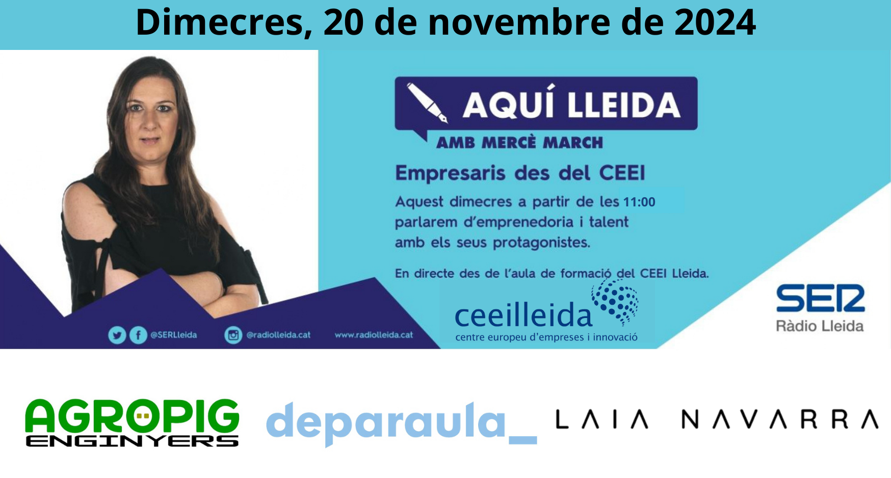 Tres empreses del CEEILleida participaran aquest dimecres, 20 de novembre, en el programa Empresaris de Ràdio Lleida-Cadena SER. Aquestes tres firmes són Agropig, Deparaula i Laia Navarra Audiovisuals, dirigides cadascuna per tres dones que, des que es van instal·lar en el viver, han consolidat i han fet créixer les seves respectives empreses. Elles són Carme Peralta, d’Agropig; Laia Dolcet, de Deparaula, i Laia Navarra, de Laia Navarra Audiovisuals..